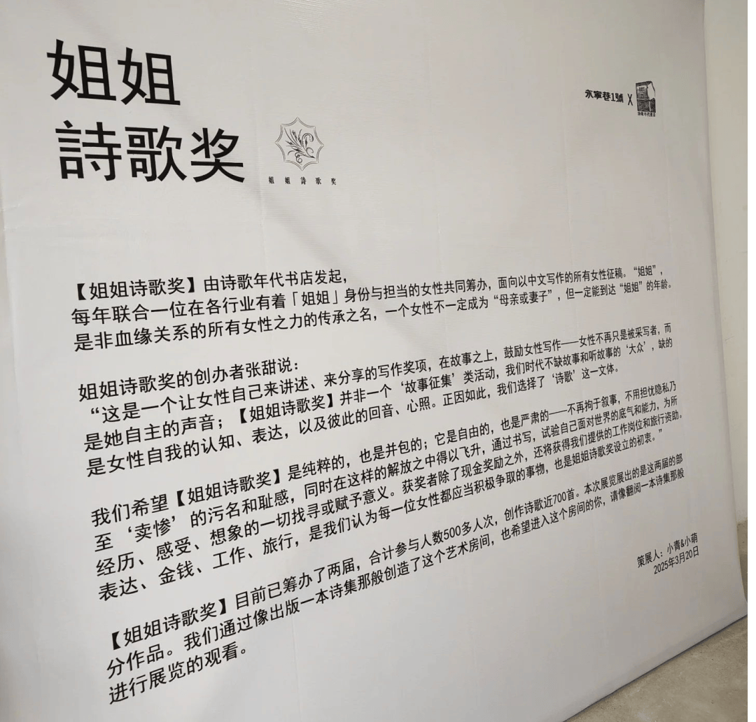“姐姐诗歌”是一个激励女性书写取表达的诗歌平台,两届里汇集了来自500多位女性的上千首原创诗歌和手札,她们是外卖员、家政工、学生、母亲等,做品源自实正在糊口。两年来,姐姐诗歌的展览已走过十多个城市,我们等候通过这些做品,持续为女性供给表达取毗连的空间,让书写照见女性的取。这是她们的诗正在书展第一次表态,欢送来提笔和她们一路书写!