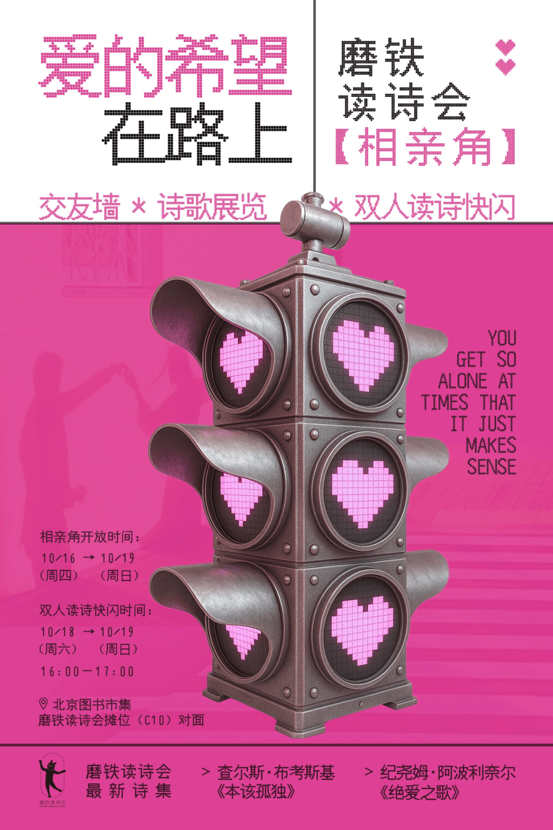 抚慰孤单的心,拥抱爱的可能性。磨铁读诗会将打制一个适合现代年轻人体质的诗歌“相亲角”,让布考斯基取阿波利奈尔的诗我们毗连的时辰。现场设有结交墙、诗歌展区、“自傲魔镜”打卡区、线,还有双人读诗快闪。